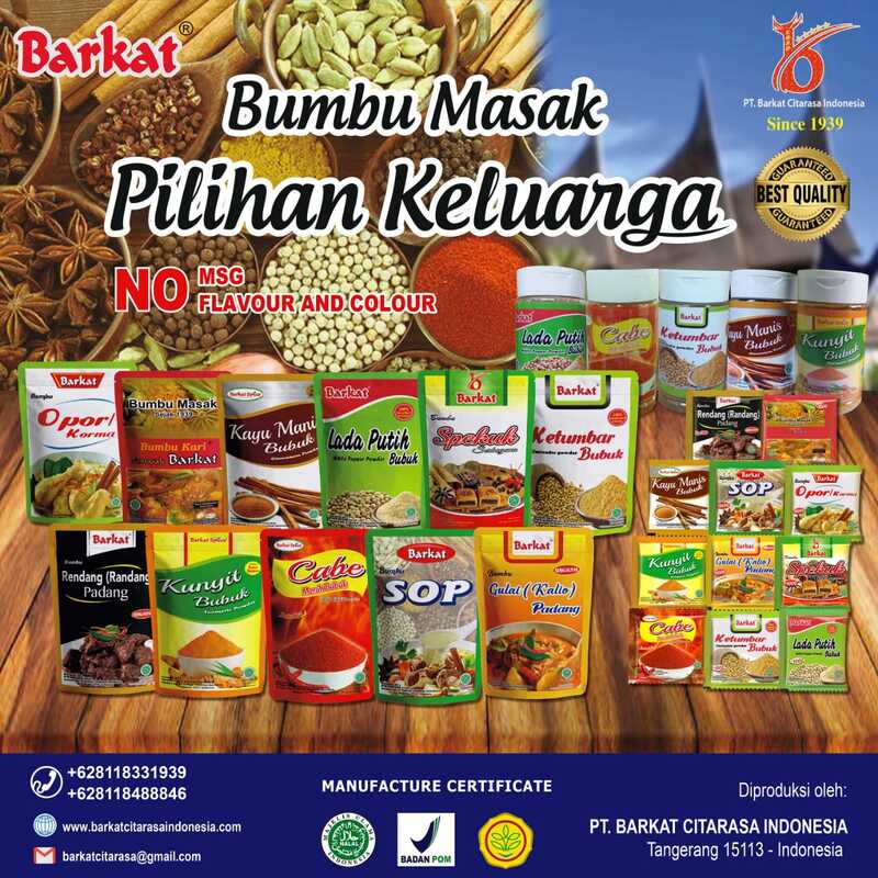 PT. Barkat Citarasa Indonesia adalah Perusahaan yang bergerak dalam pengolahan rempah - rempah dan bumbu. Berpengalaman di bidang rempah - rempah sejak tahun 1939.