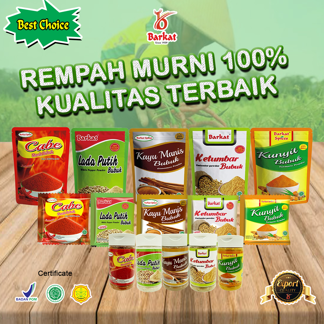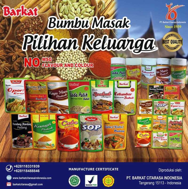 PT. Barkat Citarasa Indonesia adalah Perusahaan yang bergerak dalam pengolahan rempah - rempah dan bumbu. Berpengalaman di bidang rempah - rempah sejak tahun 1939.
